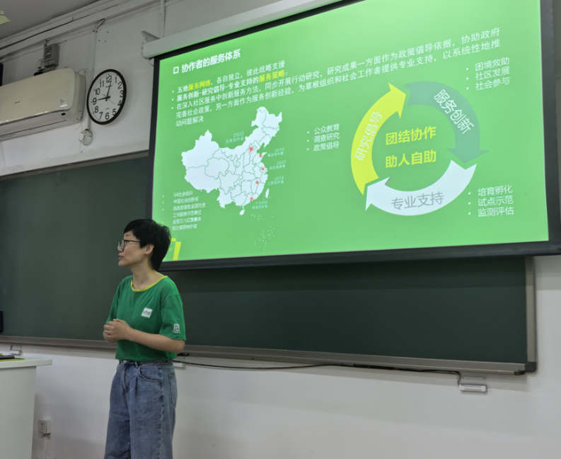 在总结环节,周群英老师分享了感受与思考。她表示,此次讲座让其对协作者“童缘”项目有了更全面系统的认知,最大触动在于看到服务对象从受助者转变为助人者的过程,这一身份转换体现了助人过程的代际传递与可持续性。协作者在培训和经验积累中推动这一转化,极具价值。