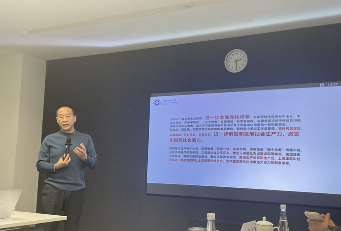 调研开始前,傅昌波教授就新时代慈善事业的功能定位及完善公共政策,促进实现政府治理同社会调节、居民自治良性互动作了授课。